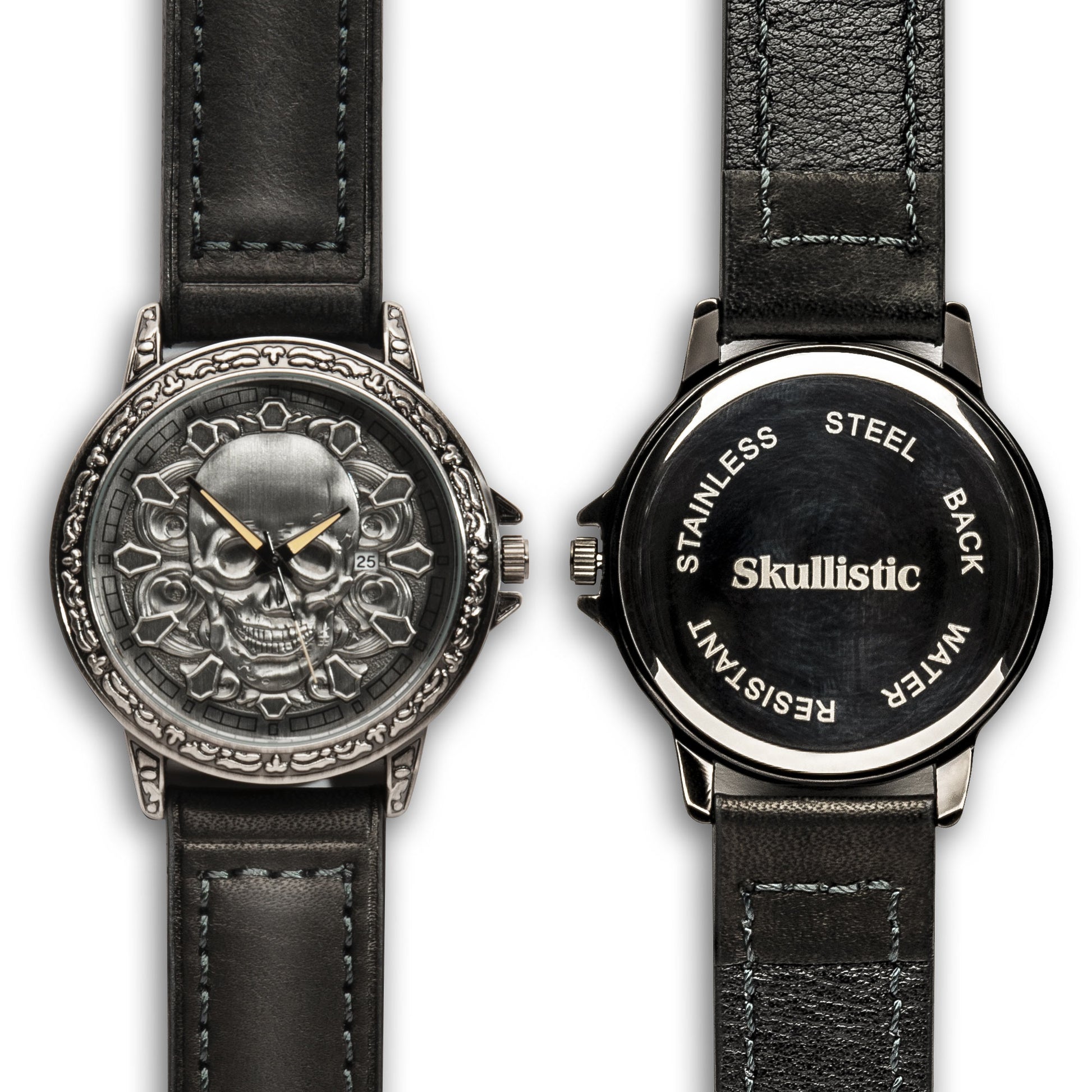 This unique skull watch features a stainless steel case and strap with unique 3D skull elements. Perfect gift for man or women who desires timepiece with an edge. Choose between metal band in matching silver color or genuine black leather band.