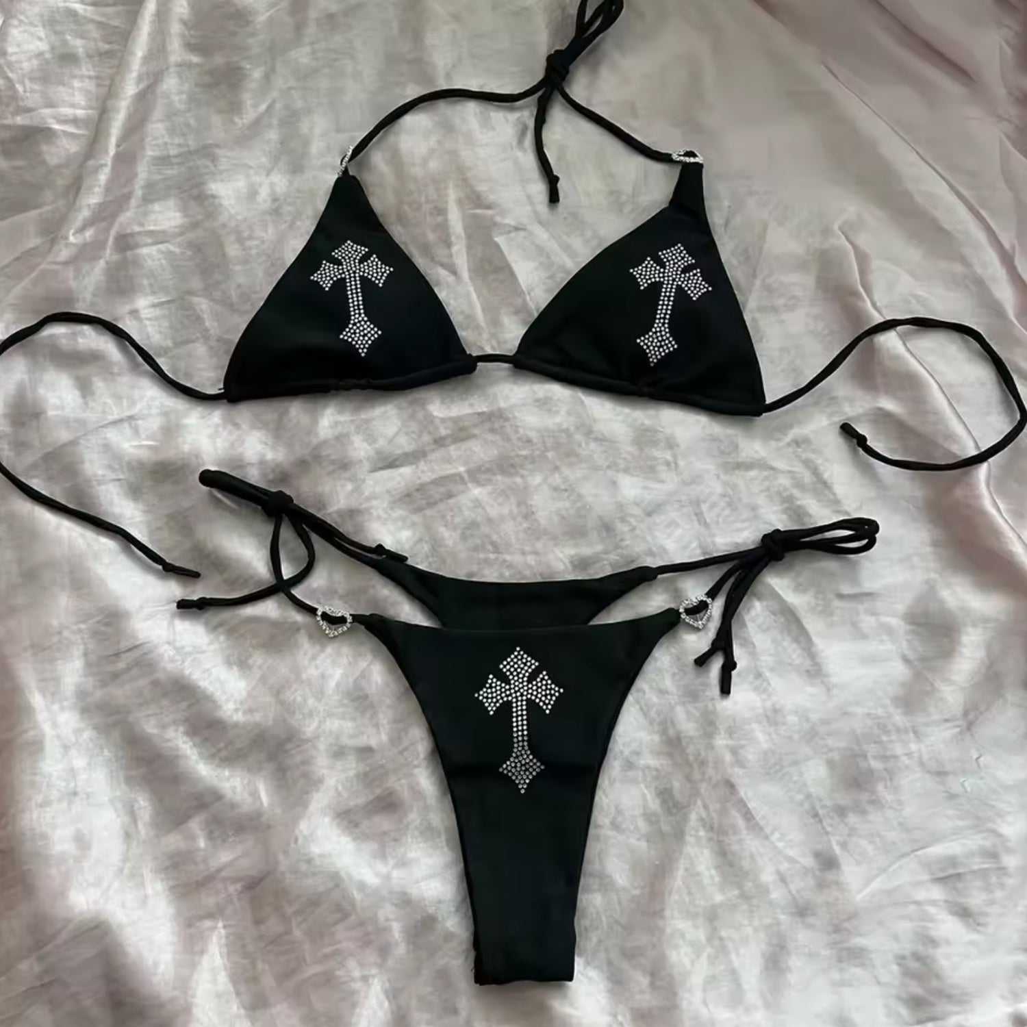 Make your summer unforgettable with this Rhinestone Cross Bikini — where edgy meets elegance!