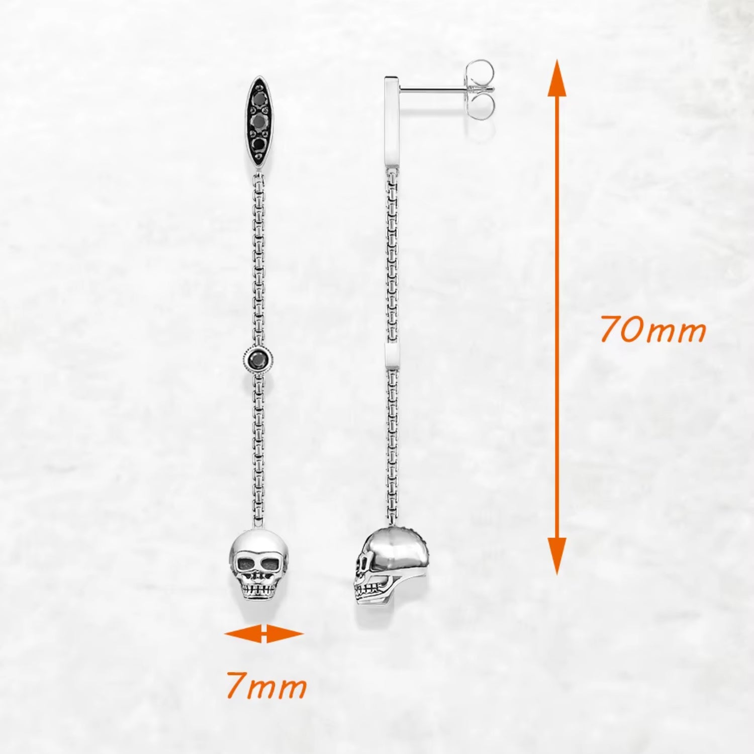 The top stud is accented with dark gemstones, adding a touch of mystery and refinement. Perfect for pairing with both casual and evening outfits, these earrings are ideal for anyone looking to express a unique, modern gothic style.